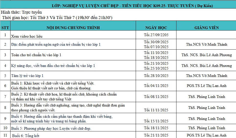 Bạn đang tìm kiếm một khóa học giúp con rèn chữ đẹp, viết đúng nét và tạo tiền đề vững chắc trước khi vào lớp 1? Hãy đăng ký ngay Khóa học Luyện chữ đẹp tiền tiểu học khóa 08 – chương trình được thiết kế đặc biệt dành cho trẻ chuẩn bị vào lớp Một, giúp các em hình thành thói quen viết đúng – viết đẹp ngay từ những nét đầu tiên.