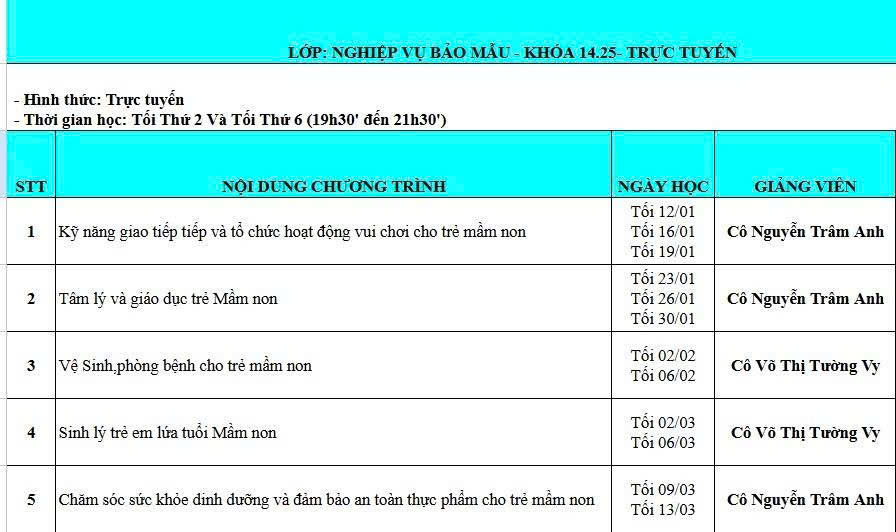 Khóa học Nghiệp vụ Bảo mẫu Khóa 14 được tổ chức với hình thức học online, lịch học buổi tối linh hoạt, phù hợp cho người đi làm và những học viên ở xa.