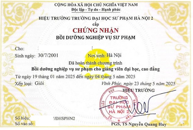 Trường Đại học Sư phạm Hà Nội 2 – là một trong những đơn vị đào tạo sư phạm hàng đầu tại Việt Nam. Chứng chỉ có giá trị pháp lý toàn quốc, là điều kiện bắt buộc để tham gia giảng dạy tại các trường đại học, học viện, cao đẳng theo quy định tại Thông tư số 12/2021/TT-BGDĐT của Bộ GD&ĐT.