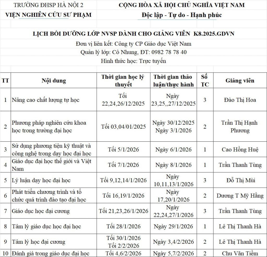 Lịch học lớp NVSP Giảng viên K15 (K8.GDVN) mới nhất – Thông tin chi tiết