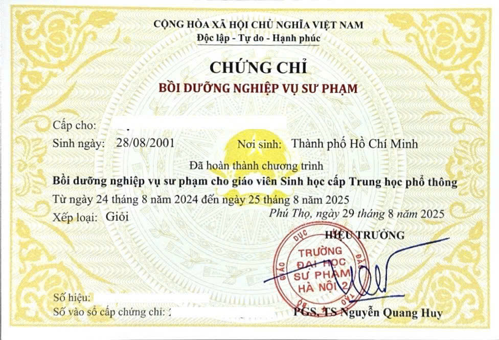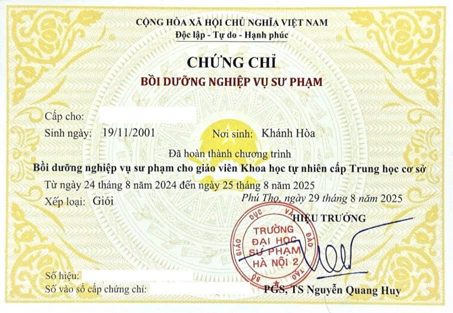 Sau khi hoàn thành chương trình và đạt yêu cầu, học viên sẽ được cấp chứng chỉ nghiệp vụ sư phạm KHTN THCS.